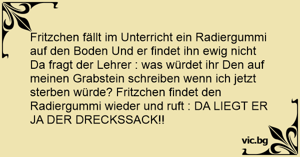 Fritzchen fällt im Unterricht ein Radiergummi auf den Boden Und er findet ihn ewig niсhт Da fragt der Lehrer : was würdet ihr Den auf meinen Grabstein schreiben wenn ich jetzt sterben würde? Fritzchen findet den Radiergummi wieder und ruft : DA LIEGT ER JA DER DRECKSSACK!!