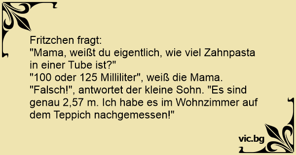 Die Mutter von Fritzchen will einkaufen gehen. Sie ruft: "Fritzchen, schau doch bitte mal im Badezimmer nach, wie viel Zahnpasta noch in der Tube ist!" Eine Weile ist es ruhig, dann ruft Fritzchen: "Sie reicht genau von der Badewanne bis zum Wohnzimmerschrank!"