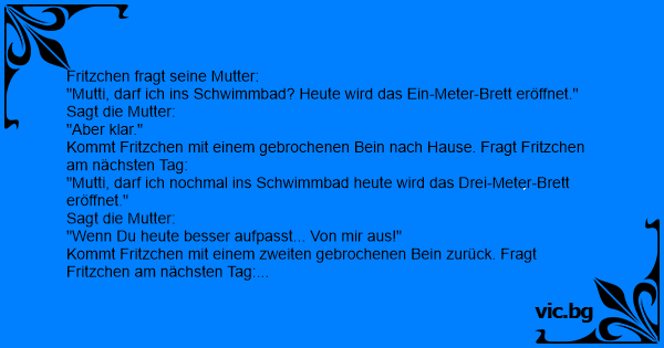 Kommt Fritzchen mit einem zweiten gebrochenen Bein zurück. Fragt Fritzchen am nächsten Tag: