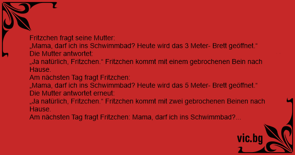 Am nächsten Tag fragt Fritzchen: Mama, darf ich ins Schwimmbad? Heute wird das 10 Meter- Brett geöffnet." Die Mutter antwortet erneut: