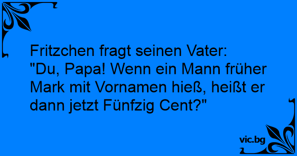 "Du, Papa! Wenn ein Mann früher Mark mit Vornamen hieß, heißt er dann jetzt Fünfzig Cent?"