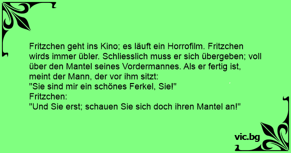 Fritzchen geht ins Kino; es läuft ein Horrofilm. Fritzchen wirds immer übler. Schliesslich muss er sich übergeben; voll über den Mantel seines Vordermannes. Als er fertig ist, meint der Mann, der vor ihm sitzt: