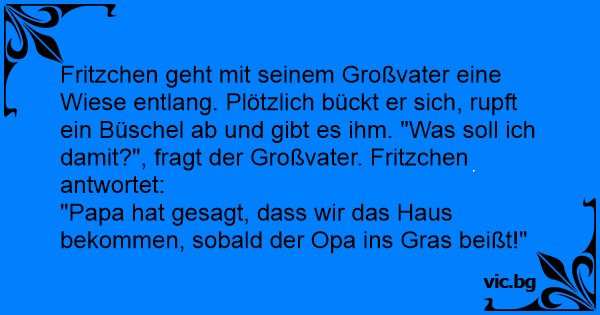 Fritzchen geht mit seinem Großvater eine Wiese entlang. Plötzlich bückt er sich, rupft ein Büschel ab und gibt es ihm. "Was soll ich damit?", fragt der Großvater. Fritzchen antwortet:
