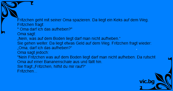 Fritzchen geht mit seiner Oma spazieren. Da liegt ein Keks auf dem Weg. Fritzchen fragt: