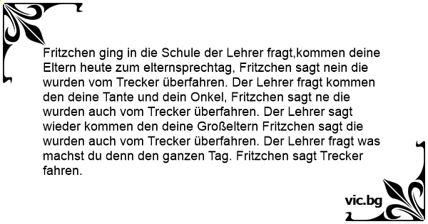 Fritzchen ging in die Schule der Lehrer fragt,kommen deine Eltern heute zum elternsprechtag, Fritzchen sagt nein die wurden vom Trecker überfahren. Der Lehrer fragt kommen den deine Tante und dein Onkel, Fritzchen sagt ne die wurden auch vom Trecker überfahren. Der Lehrer sagt wieder kommen den deine Großeltern Fritzchen sagt die wurden auch vom Trecker überfahren. Der Lehrer fragt was machst du denn den ganzen Tag. Fritzchen sagt Trecker fahren.