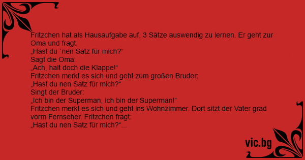Fritzchen hat als Hausaufgabe auf, 3 Sätze auswendig zu lernen. Er geht zur Oma und fragt: