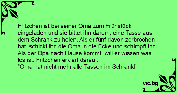 Fritzchen ist bei seiner Oma zum Frühstück eingeladen und sie bittet ihn darum, eine Tasse aus dem Schrank zu holen. Als er fünf davon zerbrochen hat, schickt ihn die Oma in die Ecke und schimpft ihn. Als der Opa nach Hause kommt, will er wissen was los ist. Fritzchen erklärt darauf: