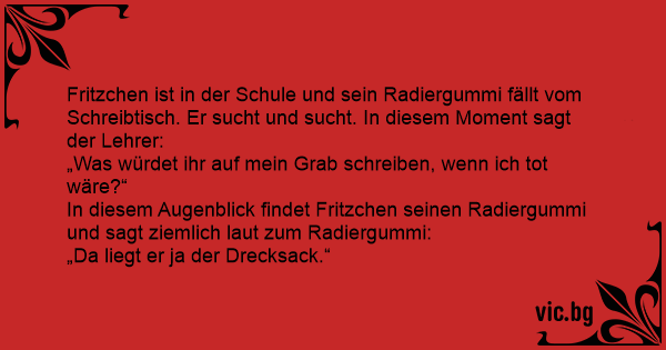 Fritzchen ist in der Schule und sein Radiergummi fällt vom Schreibtisch. Er sucht und sucht. In diesem Moment sagt der Lehrer: