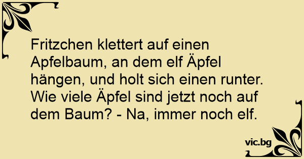 Fritzchen klettert auf einen Apfelbaum, an dem elf Äpfel hängen, und holt sich einen runter. Wie viele Äpfel sind jetzt noch auf dem Baum? - Na, immer noch elf.