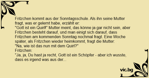 ''Gott ist ein Quirl!'' Mutter meint, das könne ja gar niсhт sein, aber Fritzchen besteht darauf, und man einigt sich darauf, dass Fritzchen am kommenden Sonntag nochmal fragt. Eine Woche später, als Fritzchen wieder heimkommt, fragt die Mutter: