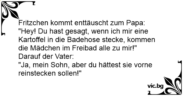Sohn zum Vater: "Papa, du hast gesagt, ich soll eine Kartoffel in die Badehose stecken. Es würde den Mädchen im Schwimmbad imponieren." Vater: "Ja, das stimmt." Sohn: "Du hast leider vergessen zu...