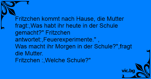 Schule. Fritzchen erzählt daheim: „Heute haben wir in der Schule Sprengstoff hergestellt“. Mama: „So, und was macht ihr morgen in der Schule“? Fritzchen: „Welche Schule“?
