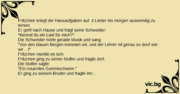Fritzchen kriegt die Hausaufgaben auf. 4 Lieder bis morgen auswendig zu lernen.