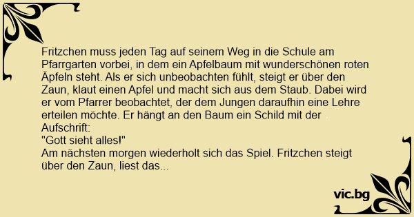 Fritzchen muss jeden Tag auf seinem Weg in die Schule am Pfarrgarten vorbei, in dem ein Apfelbaum mit wunderschönen roten Äpfeln steht. Als er sich unbeobachten fühlt, steigt er über den Zaun, klaut einen Apfel und macht sich aus dem Staub. Dabei wird er vom Pfarrer beobachtet, der dem Jungen daraufhin eine Lehre erteilen möchte. Er hängt an den Baum ein Schild mit der Aufschrift: