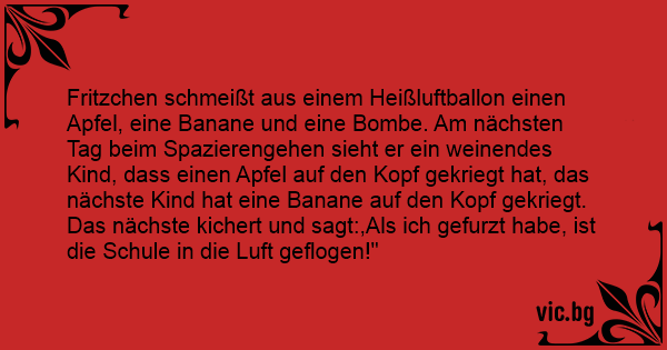 Fritzchen schmeißt aus einem Heißluftballon einen Apfel, eine Banane und eine Bombe. Am nächsten Tag beim Spazierengehen sieht er ein weinendes Kind, dass einen Apfel auf den Kopf gekriegt hat, das nächste Kind hat eine Banane auf den Kopf gekriegt. Das nächste kichert und sagt:,Als ich gefurzt habe, ist die Schule in die Luft geflogen!"