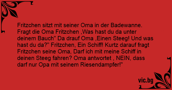 Fritzchen sitzt mit seiner Oma in der Badewanne. Fragt die Oma Fritzchen ,Was hast du da unter deinem Bauch" Da drauf Oma ,Einen Steeg! Und was hast du da?" Fritzchen, Ein Schiff! Kurtz darauf fragt Fritzchen seine Oma, Darf ich mit meine Schiff in deinen Steeg fahren? Oma antwortet , NEIN, dass darf nur Opa mit seinem Riesendampfer!"