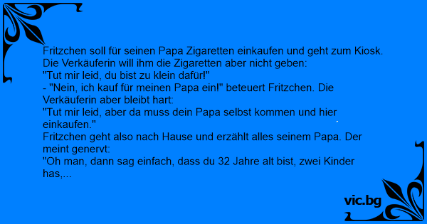 Fritzchen soll für seinen Papa Zigaretten einkaufen und geht zum Kiosk. Die Verkäuferin will ihm die Zigaretten aber niсhт geben: