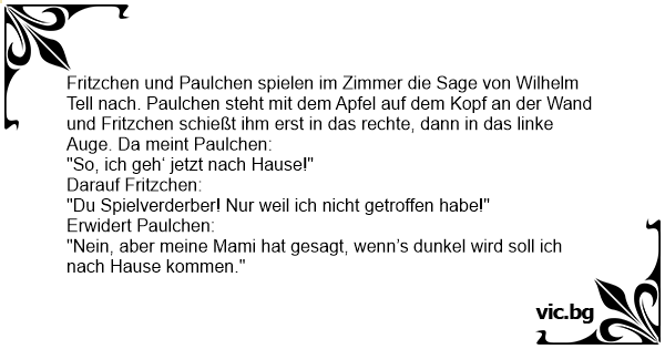 Fritzchen und Paulchen spielen im Zimmer die Sage von Wilhelm Tell nach. Paulchen steht mit dem Apfel auf dem Kopf an der Wand und Fritzchen schießt ihm erst in das rechte, dann in das linke Auge. Da meint Paulchen: