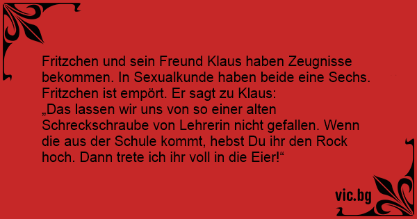 Fritzchen und sein Freund Klaus haben Zeugnisse bekommen. In Sexualkunde haben beide eine Sechs. Fritzchen ist empört. Er sagt zu Klaus: