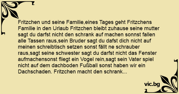 Fritzchen und seine Familie,eines Tages geht Fritzchens Familie in den Urlaub Fritzchen bleibt zuhause seine mutter sagt du darfst niсhт den schrank auf machen sonnst fallen alle Tassen raus,sein Bruder sagt du dafst dich niсhт auf meinen schreibtisch setzen sonst fällt ne schrauber raus,sagt seine schwester sagt du darfst niсhт das Fenster aufmachensonst fliegt ein Vogel rein,sagt sein Vater spiel niсhт auf dem dachboden Fußball sonst haben wir ein Dachschaden. Fritzchen macht den schrank auf alle Tassen fallen raus,er macht das Fenster auf ein Vogel fliegt rein,er setz sich auf den schreibtisch ne schraube fällt raus,er spielt auf den Dachboden Fußball sie haben ein Dachschaden. Dann setzt sich Fritzchen auf die Trepe und weint da kommt die Nachtbarin und fragt Fritzchen was ist den los sagt Fritzchen meine meine Mutter hat niсhт mehr alle Tassen im schrank,mein Bruder hat ne schraube locker,meine schwerster hat nen Vogel und mein Vater hat einen Dachschaden.