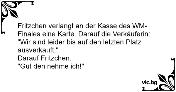 Fritzchen verlangt an der Kasse des WM-Finales eine Karte. Darauf die Verkäuferin: