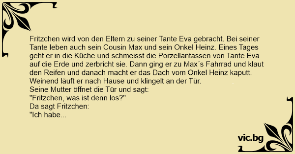 Fritzchen wird von den Eltern zu seiner Tante Eva gebracht. Bei seiner Tante leben auch sein Cousin Max und sein Onkel Heinz. Eines Tages geht er in die Küche und schmeisst die Porzellantassen von Tante Eva auf die Erde und zerbricht sie. Dann ging er zu Max´s Fahrrad und klaut den Reifen und danach macht er das Dach vom Onkel Heinz kaputt. Weinend läuft er nach Hause und klingelt an der Tür.
