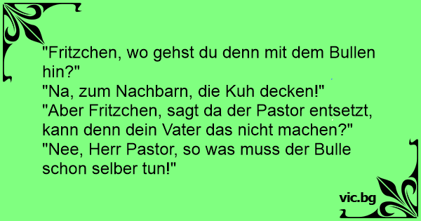 "Fritzchen, wo gehst du denn mit dem Bullen hin?" will der Pastor wissen. "Na, zum Nachbarn, die Kuh decken!" - "Aber Fritzchen! Kann das denn nicht dein Vater machen?" Darauf Fritzchen: "Nee, Herr Pastor, der kommt doch gar nicht so weit hoch!"