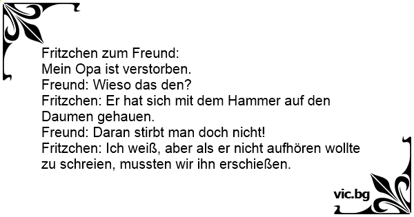 Fritzchen ist sehr traurig. Sein Freund will wissen, was er hat. “Mein Opa ist tot”, antwortet Fritzchen. Der Freund will wissen, woran er gestorben ist. – “Er wollte ein Bild aufhängen und hat sich aus Versehen mit dem Hammer auf den Daumen geschlagen.” – “Aber daran stirbt man doch nicht!” –...