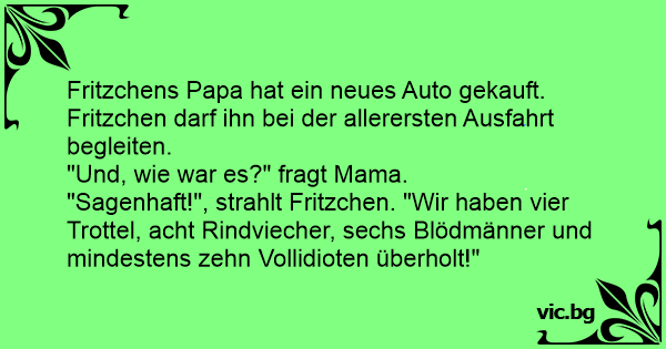 "Sagenhaft!", strahlt Fritzchen. "Wir haben vier Тrоттеl, acht Rindviecher, sechs Blödmänner und mindestens zehn Vollidioten überholt!"