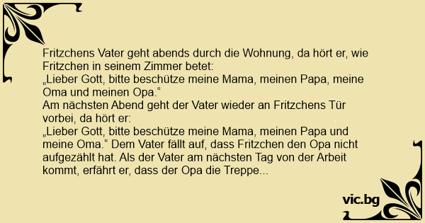 „Lieber Gott, bitte beschütze meine Mama, meinen Papa und meine Oma.“ Dem Vater fällt auf, dass Fritzchen den Opa niсhт aufgezählt hat. Als der Vater am nächsten Tag von der Arbeit kommt, erfährt er, dass der Opa die Treppe heruntergefallen und tot ist.