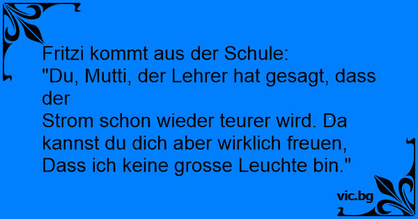 Fritzi kommt aus der Schule: "Du, Mutti, der Lehrer hat gesagt, dass der Strom schon wieder teurer wird. Da kannst du dich aber wirklich freuen, Dass ich keine grosse Leuchte bin."
