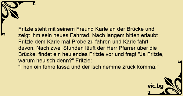 Fritzle steht mit seinem Freund Karle an der Brücke und zeigt ihm sein neues Fahrrad. Nach langem bitten erlaubt Fritzle dem Karle mal Probe zu fahren und Karle fährt davon. Nach zwei Stunden läuft der Herr Pfarrer über die Brücke, findet ein heulendes Fritzle vor und fragt "Ja Fritzle, warum heulsch denn?" Fritzle:
