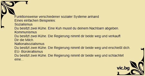 Какво е социализъм, комунизъм и капитализъм? Обясняваме с крави: Основни понятия Феодализъм: Имате 2 крави. Вашият господар прибира част от млякото. Социализъм: Имате 2 крави. Давате едната на съседа. Комунизъм: Имате 2 крави. Държавата прибира и двете крави и ви дава малко мляко....