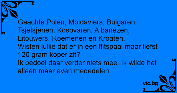 Geachte Polen, Moldaviers, Bulgaren, Tsjetsjenen, Kosovaren, Albanezen, Litouwers, Roemenen en Kroaten.