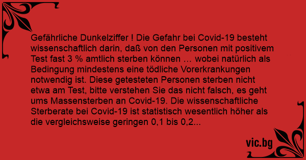 Gefährliche Dunkelziffer ! Die Gefahr bei Covid-19 besteht wissenschaftlich darin, daß von den Personen mit positivem Test fast 3 % amtlich sterben können … wobei natürlich als Bedingung mindestens eine tödliche Vorerkrankungen notwendig ist. Diese getesteten Personen sterben niсhт etwa am Test, bitte verstehen Sie das niсhт falsch, es geht ums Massensterben an Covid-19. Die wissenschaftliche Sterberate bei Covid-19 ist statistisch wesentlich höher als die vergleichsweise geringen 0,1 bis 0,2 % Mortalität der normalen Influenza. Doch schon die Influenza alleine forderte nach Schätzung des RKIs (vom Koch-Institut) während der Saison 2017/18 in Deutschland beachtliche 25 Tausend Menschenleben ! Aber keine Sau hat das interessiert … Anders heute - da muß man ja das Fürchten kriegen, wenn man das hochrechnet! Das 30-fache wie damals vielleicht - das sind rund eine Million Tote ! Nur in Deutschland, das muß man sich mal vorstellen. 1 Million geschätzte statistisch Tote in unserer schönen Heimat ! Aber auch bei den Regierungsmaßnahmen und den Folgeschäden muß man das Fürchten kriegen, aber das ist ja niсhт ganz so wichtig, wenn es um so viele Tote geht. Bei Corvid-19 wird jedenfalls viel getestet und noch mehr geschätzt. Getestet werden natürlich niсhт die Gesunden sondern nur solche Leute mit mittleren bis schweren Symptomen. Wer Covid-19 hat ohne Symptome, der wird niсhт getestet, der gehört zur Dunkelziffer. Und die Dunkelziffer bei Covid-19 ist völlig unklar. Unklar ist leider auch, wie schnell sich das Virus überträgt und welche Übertragungswege es nimmt. Was wir wissen ist: durch Corvid-19 und seine Unklarheiten können in Deutschland rund 1 Million geschätzter Menschen sterben. Da muß man auch für die deutsche Zukunft fürchten ! Man stelle sich mal vor: bei den vielen Krankheiten heute, die alle niсhт ganz erforscht sind - da gibt es ja Dunkelheit und unklare Sachen ohne Ende - also da muß man befürchten, daß kein Mensch jemals wieder normal leben darf … Übrigens, der besondere Wert von hoch geschätzten Statistiken zeigt sich auch bei anderen tödlichen Erhebungen. Z. B. beim Tod durch Ertrinken. Die Statistik über das Ertrinken von Menschen konnte aufgestellt werden durch amtliche Erhebungen entlang der gesamten Atlantik- und Pazifikküste Amerikas, signiert von Spezialisten der amerikanischen Küstenwachen in Zusammenarbeit mit der WHO. Sie wurde außerdem durch Stufenprogramme von Computern geprüft. In dieser Statistik zeigt sich in erschreckender Weise Folgendes: Die Fähigkeit schwimmen zu können ist lebensgefährlich ! Nichtschwimmer leben dagegen vergleichsweise sicher ! Schwimmer ertrinken zweifelsfrei wesentlich häufiger als Nichtschwimmer ! Die unklare Dunkelziffer dabei ist nur die Zahl der Nichtschwimmer beim Langzeit-Test im tiefen Wasser … aber an Schnelltests wird gearbeitet