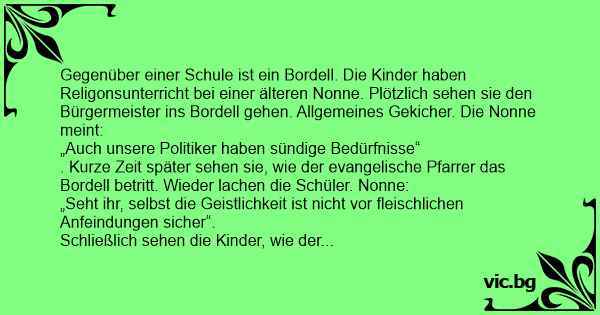 . Kurze Zeit später sehen sie, wie der evangelische Pfarrer das Bordell betritt. Wieder lachen die Schüler. Nonne: