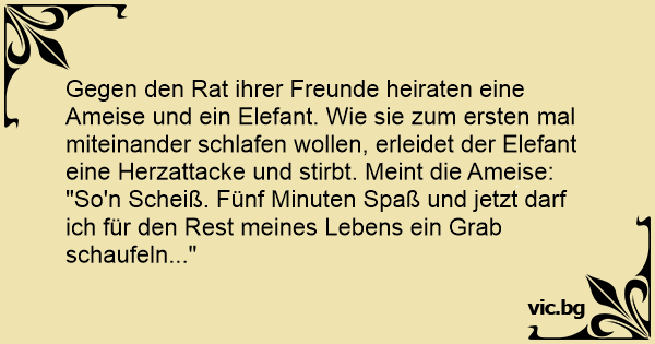 Gegen den Rat ihrer Freunde heiraten eine Ameise und ein Elefant. Wie sie zum ersten mal miteinander schlafen wollen, erleidet der Elefant eine Herzattacke und stirbt. Meint die Ameise: