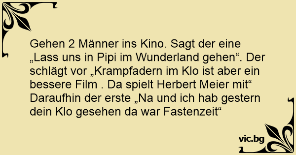 Gehen 2 Männer ins Kino. Sagt der eine „Lass uns in Pipi im Wunderland gehen“. Der schlägt vor „Krampfadern im Klo ist aber ein bessere Film . Da spielt Herbert Meier mit“ Daraufhin der erste „Na und ich hab gestern dein Klo gesehen da war Fastenzeit“