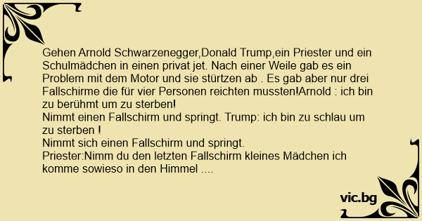 Gehen Arnold Schwarzenegger,Donald Trump,ein Priester und ein Schulmädchen in einen privat jet. Nach einer Weile gab es ein Problem mit dem Motor und sie stürtzen ab . Es gab aber nur drei Fallschirme die für vier Personen reichten mussten!Arnold : ich bin zu berühmt um zu sterben!