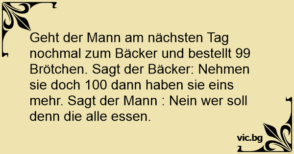 Geht der Mann am nächsten Tag nochmal zum Bäcker und bestellt 99 Brötchen. Sagt der Bäcker: Nehmen sie doch 100 dann haben sie eins mehr. Sagt der Mann : Nein wer soll denn die alle essen.