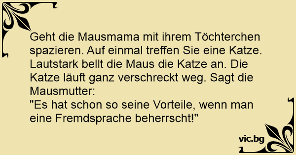 Geht die Mausmama mit ihrem Töchterchen spazieren. Auf einmal treffen Sie eine Katze. Lautstark bellt die Maus die Katze an. Die Katze läuft ganz verschreckt weg. Sagt die Mausmutter: