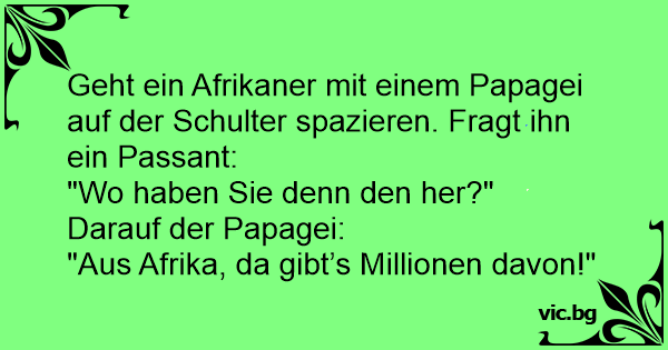 Kommt ein Neger in eine Bar, mit einem Papagei auf der Schulter. Fragt der Wirt: "Wo haben sie den denn her?" Sagt der Papagei: "Aus Afrika!"
