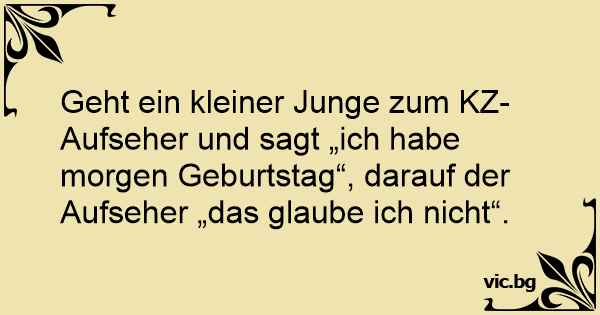 Geht ein kleiner Junge zum KZ-Aufseher und sagt „ich habe morgen Geburtstag“, darauf der Aufseher „das glaube ich niсhт“.