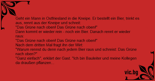 Geht ein Mann in Ostfriesland in die Kneipe. Er bestellt ein Bier, trinkt es aus, rennt aus der Kneipe und schreit: