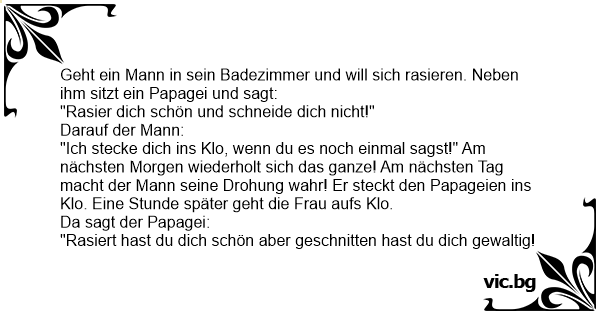 "Ich stecke dich ins Klo, wenn du es noch einmal sagst!" Am nächsten Morgen wiederholt sich das ganze! Am nächsten Tag macht der Mann seine Drohung wahr! Er steckt den Papageien ins Klo. Eine Stunde später geht die Frau aufs Klo.