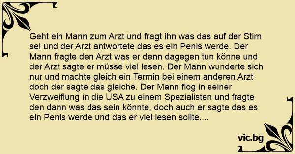 Geht ein Mann zum Arzt und fragt ihn was das auf der Stirn sei und der Arzt antwortete das es ein Реnis werde. Der Mann fragte den Arzt was er denn dagegen tun könne und der Arzt sagte er müsse viel lesen. Der Mann wunderte sich nur und machte gleich ein Termin bei einem anderen Arzt doch der sagte das gleiche. Der Mann flog in seiner Verzweiflung in die USA zu einem Spezialisten und fragte den dann was das sein könnte, doch auch er sagte das es ein Реnis werde und das er viel lesen sollte. Dem Mann wurde das echt alles zu dumm und fragte den Spezialisten: