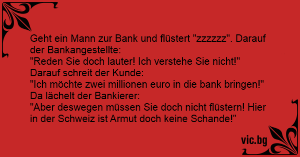 Geld in der Schweiz einzahlen Armut in der Schweiz В швейцарска банка един клиент се приближава до служител и му шепне заговорнически: Ateina naujas rusas į Šveicarijos banką: - Noriu padėti pinigus į sąskaitą. - Kiek norite padėti? Naujasis rusas pašnibždomis: - Penkis milijonus dolerių. Tarnautojas: - Galite kalbėti garsiai,... Een man loopt een Zwitserse bank binnen en vraagt: ' Kan men hier geld beleggen?' ' Hoeveel?' ' 50.000 euro', fluistert de man. ' U hoeft niet te fluisteren,' zegt de bankbediende, 'armoede is hier...