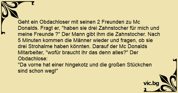 Geht ein Obdachloser mit seinen 2 Freunden zu Mc Donalds. Fragt er, "haben sie drei Zahnstocher für mich und meine Freunde ?" Der Mann gibt ihm die Zahnstocher. Nach 5 Minuten kommen die Männer wieder und fragen, ob sie drei Strohalme haben könnten. Darauf der Mc Donalds Mitarbeiter, "wofür braucht ihr das denn alles?" Der Obdachlose: