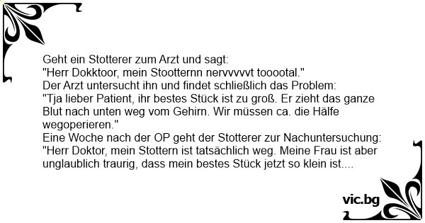 "Herr Doktor, mein Stottern ist tatsächlich weg. Meine Frau ist aber unglaublich traurig, dass mein bestes Stück jetzt so klein ist. Können wir das bitte rückgängig machen?