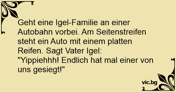 Geht eine Igel-Familie an einer Autobahn vorbei. Am Seitenstreifen steht ein Auto mit einem platten Reifen. Sagt Vater Igel: